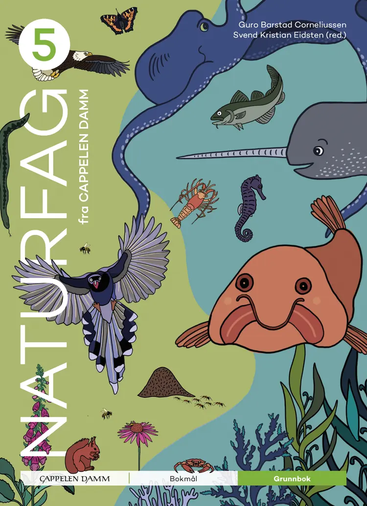 Naturfag 5 Grunnbok inneholder kapitlene Lær å forske!, Systemer i naturen, Teknologi (intro), Systemer i menneskekroppen og Universets påvirkning på jorda.
